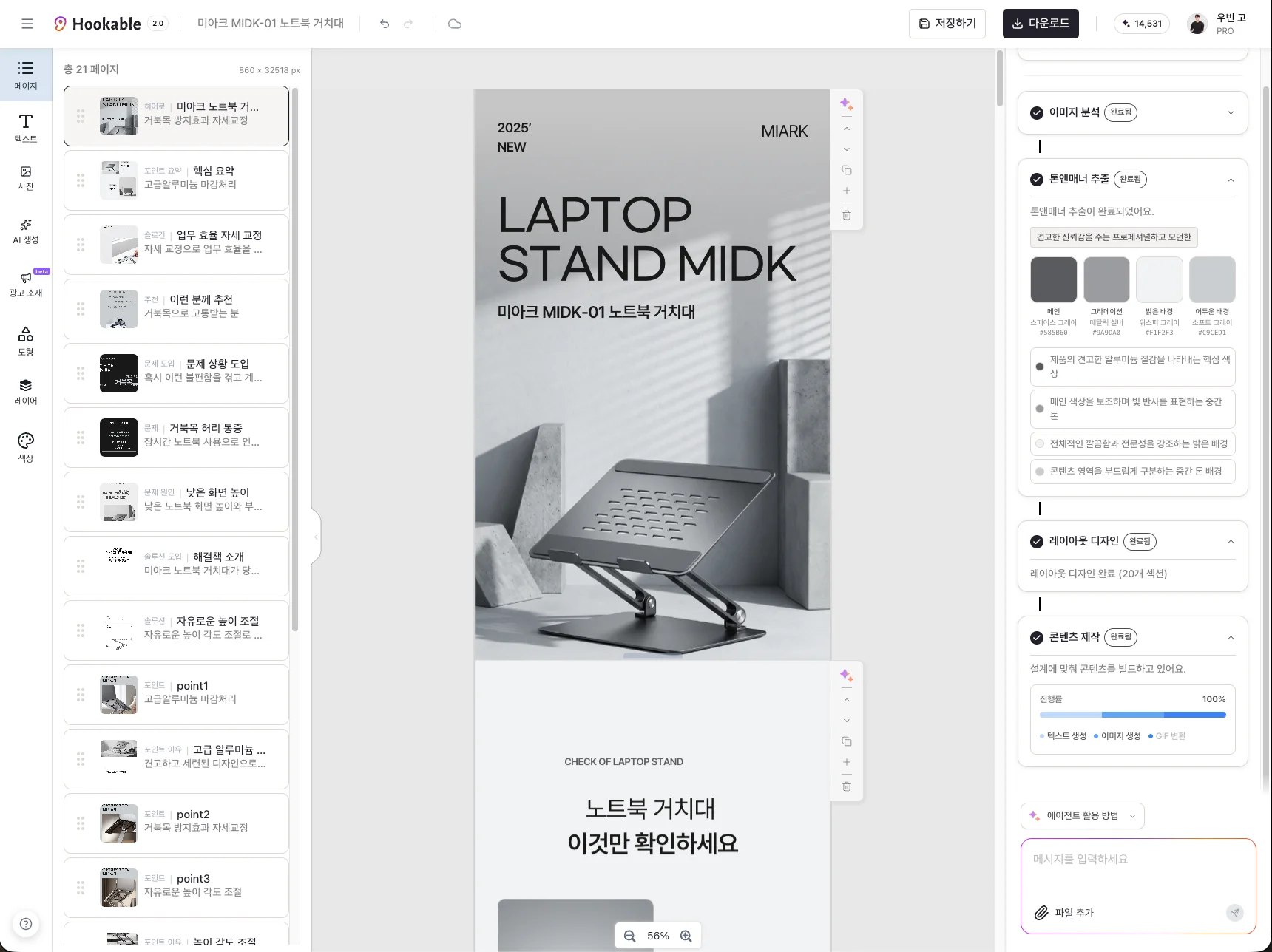 후커블은 한국형 이커머스 상세페이지 구조를 가장 잘 이해하고, 기획부터 퀄리티 높은 디자인까지 전 과정을 완벽하게 책임지는 '상세페이지 특화 AI 에이전트'입니다. [후커블 공식 웹사이트] 기존 템플릿들이 가지는 획일화 문제나 수동 디자인의 한계를 넘어서, 대화형 AI가 제품 맥락에 맞는 카피라이팅, 연출 이미지, GIF를 알아서 자동 생성합니다.