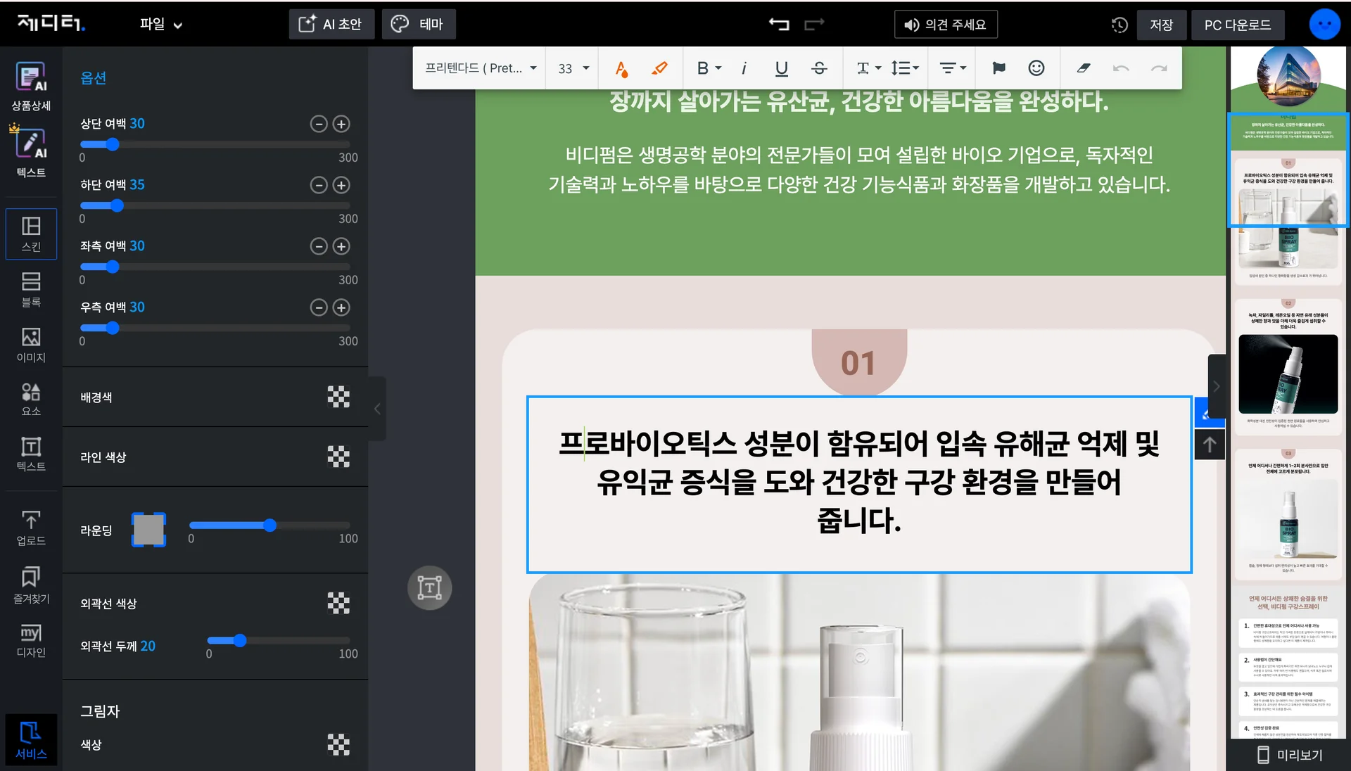 상세페이지 외에도 썸네일, 영상, 포스터 등 다양한 형태의 디자인 에셋을 하나의 툴에서 만들 수 있음