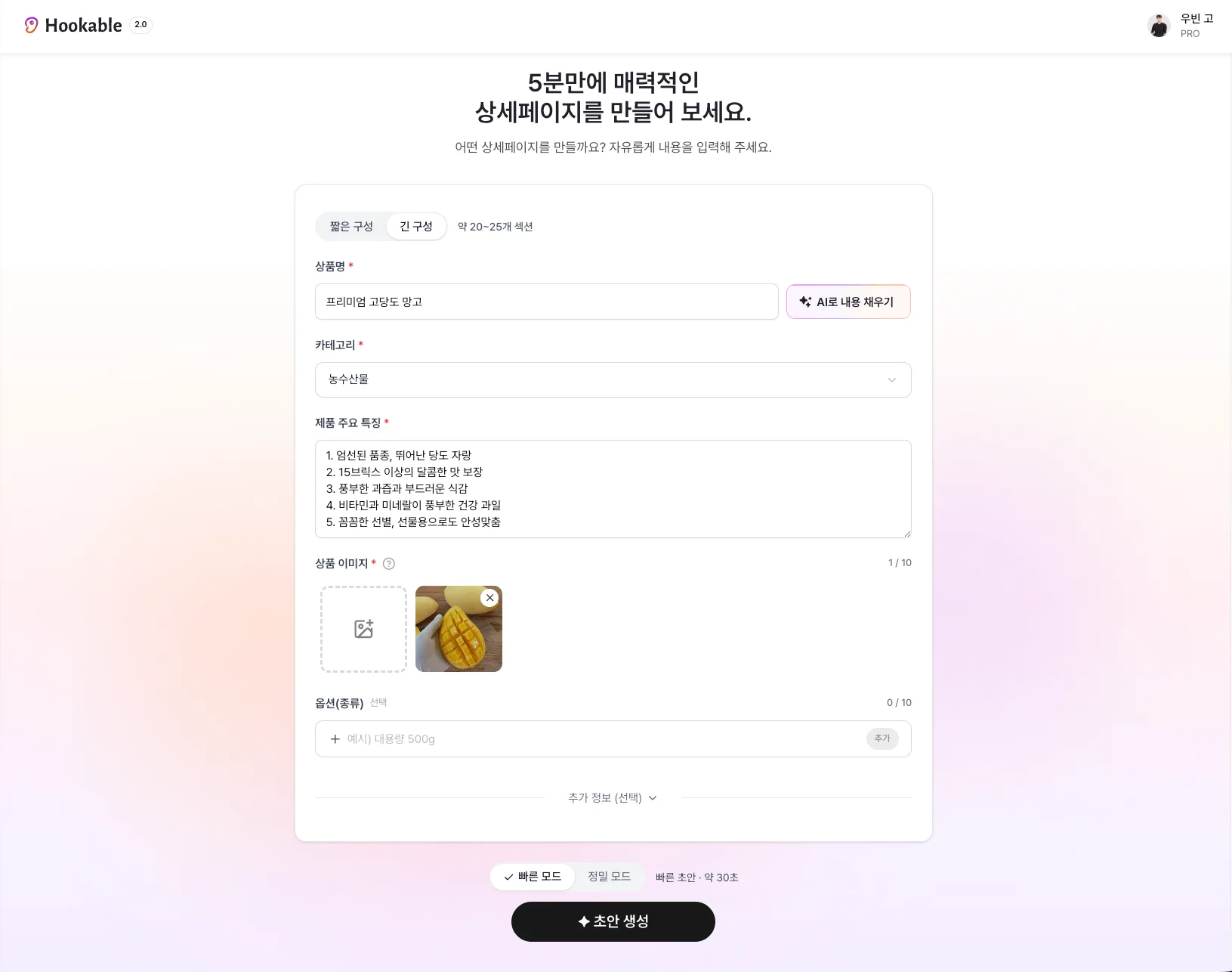 간단한 상품명 입력만으로 AI가 분석하여 1분 만에 최적의 레이아웃과 템플릿 초안을 생성해 줌